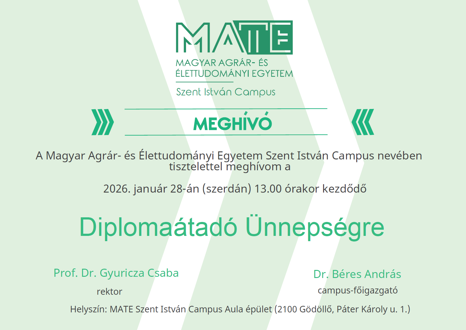 A MATE Szent István Campus 2025/26-os tanév téli diplomaátadó ünnepségeire az alábbi időpontokban kerül sor az Aula épületben: