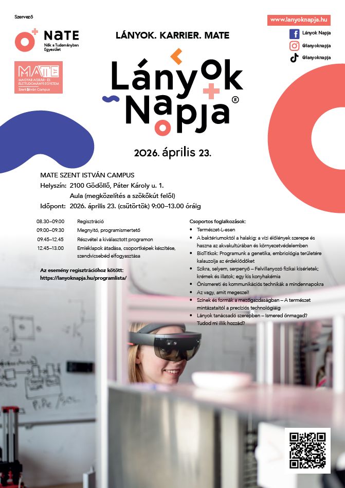 A MATE Szent István Campus idén is csatlakozik a Lányok Napja országos pályaorientációs naphoz, amely a STEM területekhez - azaz a tudomány, a technológia, a mérnöki és matematikai tudomány világához - közel álló szakmákat népszerűsítő nap diáklányok részére. Az eseményt a Nők a Tudományban Egyesület 2026. április 23-án 15. alkalommal szervezi meg.